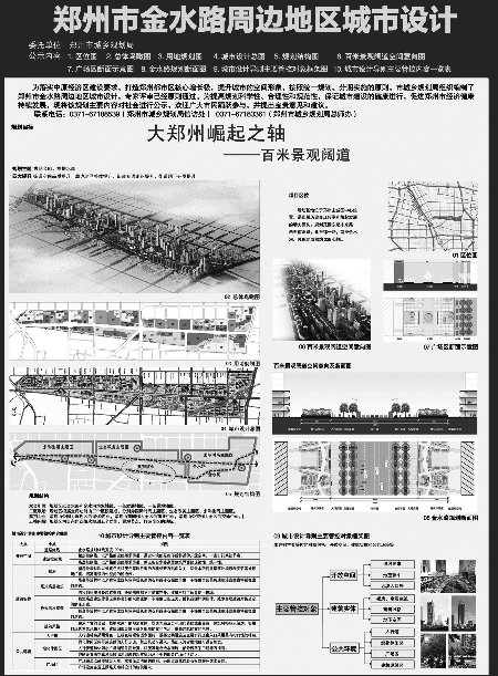 鄭州市規(guī)劃局相關負責人說,金水路未來路-南陽路路段全長約5公里,基本上是金水路最擁堵的地方。目前,該路段寬度在45米到60米之間。對此,鄭州市規(guī)劃局專門編制“鄭州市金水路周邊地區(qū)城市設計”,將金水路規(guī)劃紅線拓寬為100米。簡言之,就是要將現(xiàn)在寬度為50米左右的金水路未來路-南陽路路段拓寬成“百米景觀闊道”。該規(guī)劃方案已原則通過專家評審,正在鄭州市規(guī)劃局網站上進行公示。