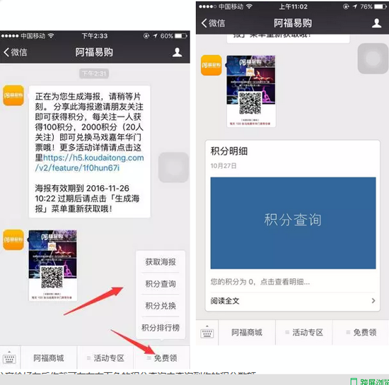 首先點擊右小角的免費領(lǐng),然后點擊分享海報,分享給好友關(guān)注阿福易購的微信公號就可獲得積分。一個好友一百個積分,20個好友就可獲得2千個積分就能兌換馬戲門票。