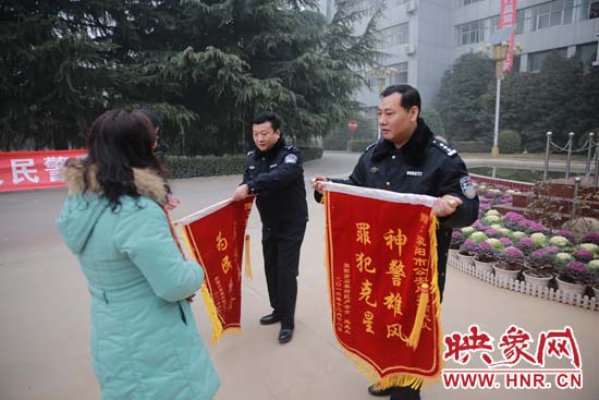 映象網(wǎng)訊(記者 王文凱 通訊員 牛智瑞 薛勇)滎陽(yáng)17歲男孩盧健(化名)在被困傳銷(xiāo)窩點(diǎn)21天后,滎陽(yáng)警方跨省將其營(yíng)救。20日上午8時(shí)許,心存感激的孩子父母及親屬敲鑼打鼓來(lái)到滎陽(yáng)市公安局,把“匡扶正義,為民服務(wù)”“神警雄風(fēng),罪犯克星”,兩面錦旗贈(zèng)給公安局,局長(zhǎng)夏日紅和政治部主任楚宏偉親自從家屬手中接過(guò)兩面錦旗。無(wú)法表達(dá)內(nèi)心感激之情的盧女士拿出兩萬(wàn)元現(xiàn)金要對(duì)專(zhuān)案組民警表示謝意,遭到夏日紅局長(zhǎng)拒絕。