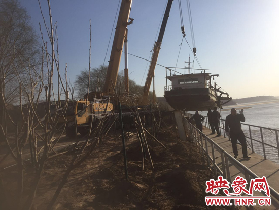 3月1日,執(zhí)法人員又來到汜水鎮(zhèn)趙村沙場岸邊,對一艘重達(dá)50噸的非法采砂船進(jìn)行起吊離上岸。