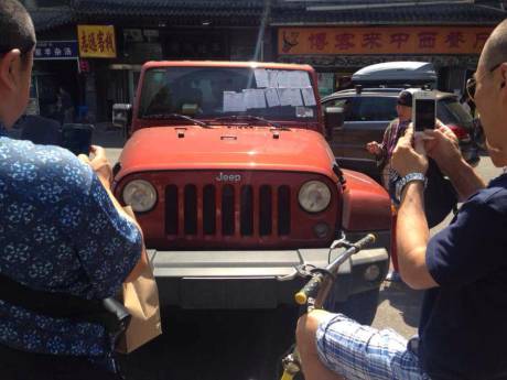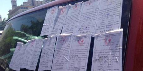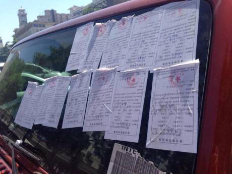 一輛紅色越野車上被10余張罰單覆蓋,引來不少市民圍觀。擋風(fēng)玻璃、后視鏡、前門的車窗上都被交警的罰單糊住了。