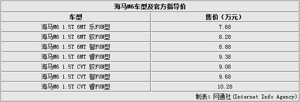 M6作為海馬2.0時代重要的一款車型,moofun系統(tǒng)的加入使得該車在造車理念上就與以往不同,加之外觀造型上運動流暢的轎跑風格,內飾也更加年輕化布局,黃金的動力組合,該車的整體性能可圈可點,7.68萬元的起售價也足夠親民,相信海馬M6的市場前景將非常廣闊。(網通社 2015年4月20日 上海報道)