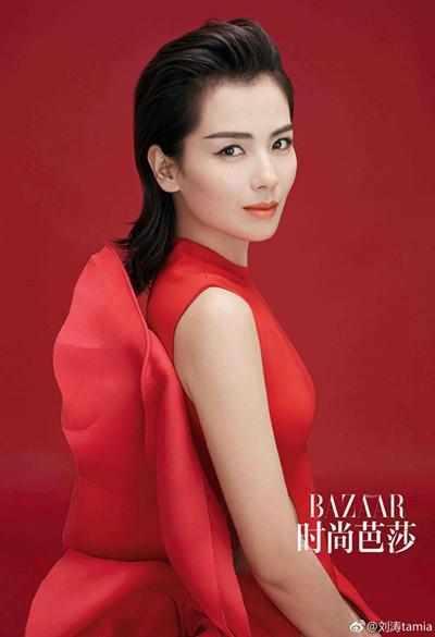 為雜志拍攝大片的時候,劉濤身穿黑色的寬松衣服,后背短發(fā),烈焰紅唇,個性十足的耳飾,整體造型又酷又美的!