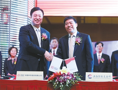 6月8日,中國中車股份有限公司副董事長劉化龍(左)與上海證券交易所副總經理徐明簽訂《上市協議書》。當日,中國中車在上交所鳴鑼上市。