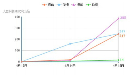 上圖可以看出,自4 月14 日辭職信流傳開來,網(wǎng)絡(luò)關(guān)注度持續(xù) 攀升。其中,微博關(guān)注度始終處于較高態(tài)勢,成為此事件的傳播主場。