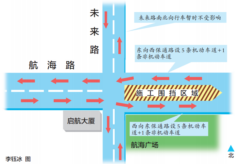 昨日,記者從交警四大隊了解到,隨著航海路一線地鐵5號線施工的推進,航海路未來路口即將開始搭建新的圍擋進行站體施工,25、26日進行模擬實驗,27日正式圍擋。屆時航海路東西方向車輛將會改行到新修的保通路面,由雙向8車道減為雙向5車道。未來路南北方向車輛暫不受影響。