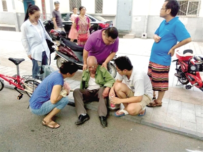 本報(bào)訊 8月14日18時(shí)許,嵩山路與伊河路交叉口東北角,一位老人行走中搖搖晃晃地倒在了人行道上。