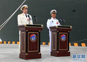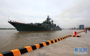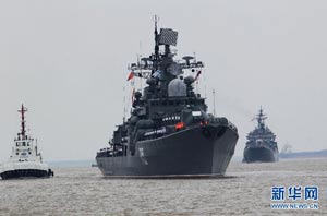 當(dāng)日,參加中俄“海上聯(lián)合—2014”軍事演習(xí)的俄方艦艇陸續(xù)駛抵上海某軍港。中俄兩國(guó)海軍互鳴禮炮,中方為來(lái)訪的俄艦舉行隆重歡迎儀式。俄羅斯太平洋艦隊(duì)旗艦“瓦良格”號(hào)導(dǎo)彈巡洋艦駛?cè)胲姼蹠r(shí),參加歡迎儀式的軍樂(lè)隊(duì)奏響歡迎曲。隨后,“快速”號(hào)驅(qū)逐艦、“潘捷列耶夫海軍上將”號(hào)大型反潛艦、“伊利姆”號(hào)中型海洋油船、“涅維爾斯科伊海軍上將”號(hào)大型登陸艦,“卡拉爾”號(hào)海洋拖船陸續(xù)駛?cè)敫劭凇_@次聯(lián)合軍事演習(xí),中俄海軍都派出了主戰(zhàn)艦艇參加。中方參演兵力包括導(dǎo)彈驅(qū)逐艦、導(dǎo)彈護(hù)衛(wèi)艦、綜合補(bǔ)給艦以及導(dǎo)彈艇等水面艦艇8艘、潛艇2艘、固定翼飛機(jī)9架。俄方參演兵力包括巡洋艦、反潛艦、驅(qū)逐艦、登陸艦、油船和海洋拖船等水面艦艇6艘。此外,為執(zhí)行海上聯(lián)合解救被劫持船只、護(hù)航等特殊任務(wù),雙方還派出艦載直升機(jī)、特戰(zhàn)分隊(duì)等兵力參加此次演習(xí)。新華社記者 查春明攝