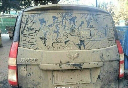 網(wǎng)友在成都偶遇一臟不溜秋的面包車!走近一看,后檔風玻璃上畫了一副美女圖,惟妙惟肖!~你只覺得我沒錢洗車,卻不知道我也有一顆藝術(shù)的心~~只是朋友,車牌被擋住了,等會兒警察蜀黍過來……