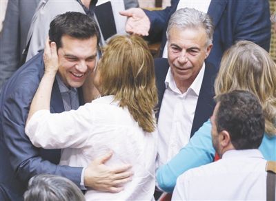 11日,希臘議會通過旨在解決債務(wù)問題的新協(xié)議草案,議員擁抱總理齊普拉斯表示祝賀。