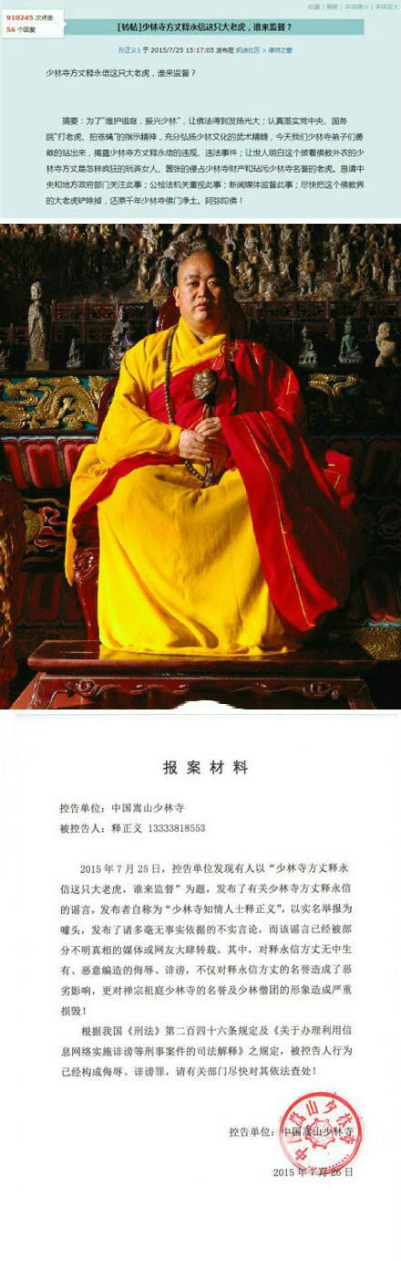 近日,一位自稱“少林寺知情人士釋正義”的人在網(wǎng)上發(fā)布“少林寺方丈釋永信這只大老虎,誰來監(jiān)督”的帖子,對此,中國嵩山少林寺官方網(wǎng)站發(fā)布報案材料,要求“有關(guān)部門盡快對造謠者依法進行查處”。