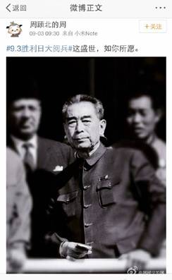 讓人難忘的細(xì)節(jié)不僅僅在閱兵場(chǎng)上。3日上午9時(shí)30分,習(xí)近平主席偕夫人彭麗媛正在天安門迎候各國(guó)嘉賓,閱兵尚未正式開始,會(huì)場(chǎng)內(nèi)外興奮期待的氛圍漸濃。就在此時(shí),網(wǎng)友“周顧北的周”發(fā)布了一條微博“這盛世,如你所愿”,配圖是一張周恩來(lái)總理的老照片。短短的七字微博引發(fā)了網(wǎng)友的強(qiáng)烈共鳴,轉(zhuǎn)發(fā)已過(guò)百萬(wàn)?!伴_國(guó)大典的時(shí)候飛機(jī)不夠,周總理說(shuō)飛兩遍,現(xiàn)在再也不需要飛兩遍了,要多少有多少。山河猶在,國(guó)泰民安。當(dāng)年送你的十里長(zhǎng)安街,如今已是十里繁榮?!?/p>
