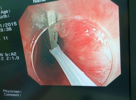 隨后,范醫(yī)生先用圈套器套取出了長10厘米的鑷子,再一個一個地取出了打火機。整個取出過程小心謹慎而又一氣呵成,只用了不到10分鐘。