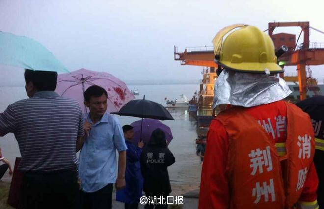 6月2日,消防救援人員在事發(fā)現(xiàn)場。 6月1日晚,一艘從南京駛往重慶的客船“東方之星”輪在長江中游湖北監(jiān)利水域突遇龍卷風發(fā)生翻沉。事發(fā)客船共有458人,其中旅客406人。圖為目前客船已沉入江中,呈倒扣狀,給救援工作造成極大困難。(楊宏斌、王馨、田悅)圖片來源:《湖北日報》官方微博