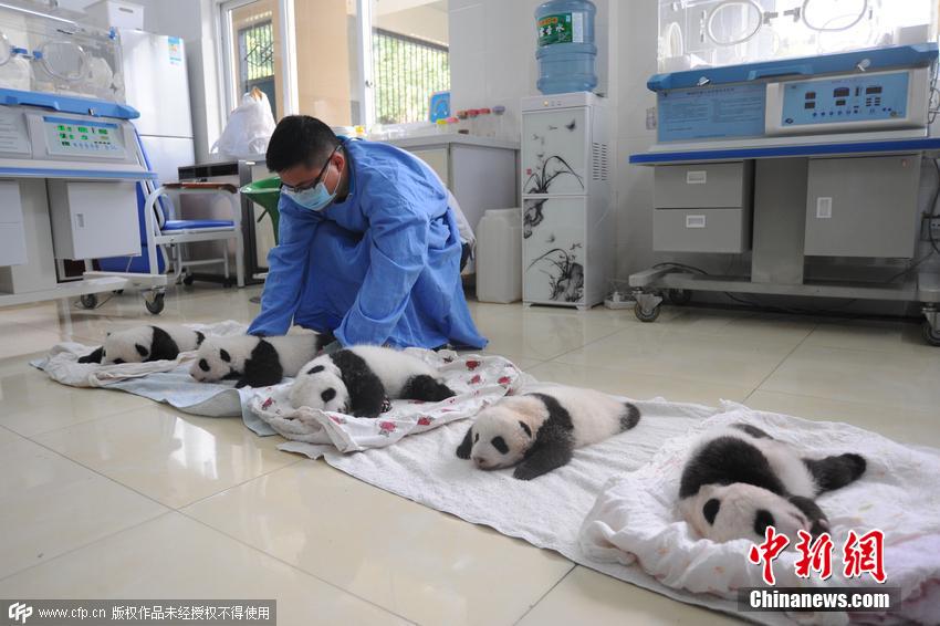 工作人員對熊貓寶寶逐個做檢查。截止目前,研究中心共繁育大熊貓14胎21仔,成活20仔,目前尚有待產(chǎn)大熊貓,有望打破新的繁育記錄。 圖片來源:CFP視覺中國