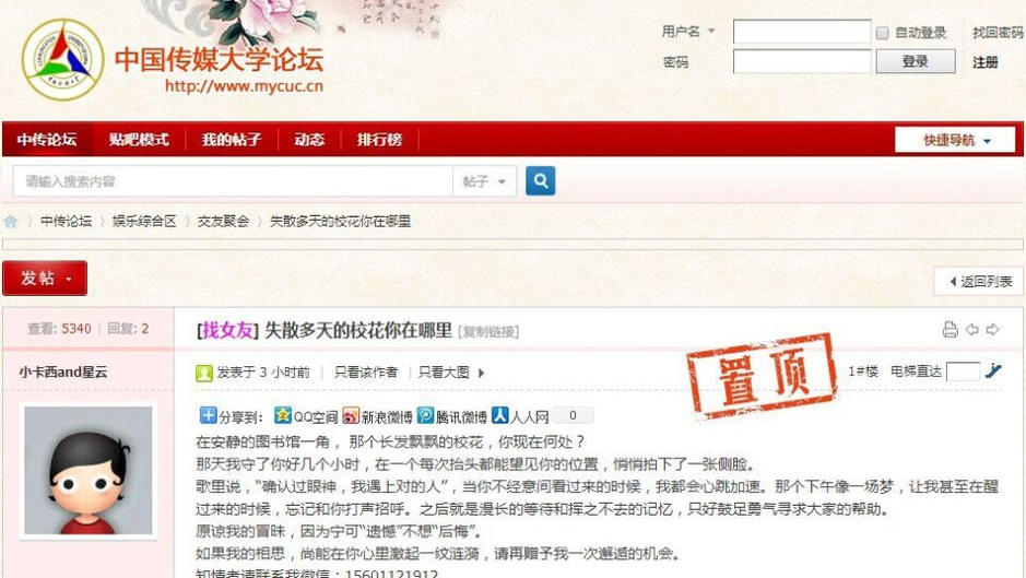 正值開學(xué)季,中國傳媒大學(xué)驚現(xiàn)癡情男,張貼了數(shù)百張海報(bào)只為表白?;ǎ瑩?jù)照片顯示,海報(bào)中有女孩側(cè)臉照片,還留下男生的聯(lián)絡(luò)方式,甚是精細(xì)。