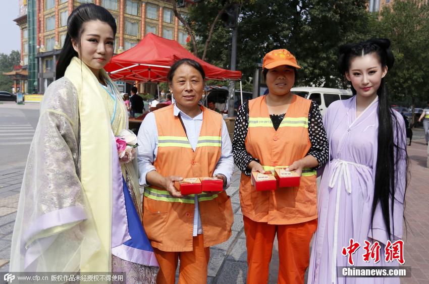 9月23日,河南鄭州古裝愛(ài)好者扮成“花千骨”走上街頭,為環(huán)衛(wèi)工人送月餅迎中秋。盧鍵 攝 圖片來(lái)源:CFP視覺(jué)中國(guó)