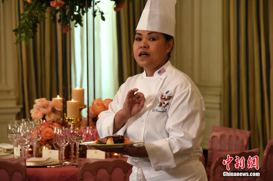 當(dāng)?shù)貢r(shí)間9月24日,美國白宮第一夫人辦公室發(fā)布了白宮為中國國家主席習(xí)近平和夫人彭麗媛舉行的國宴的菜單,并介紹了餐桌布置等情況。據(jù)這份菜單,紹興黃酒和南瓜月餅將亮相國宴。此外,白宮還邀請(qǐng)了華裔名廚參與此次國宴的準(zhǔn)備。 中新社記者 刁海洋攝