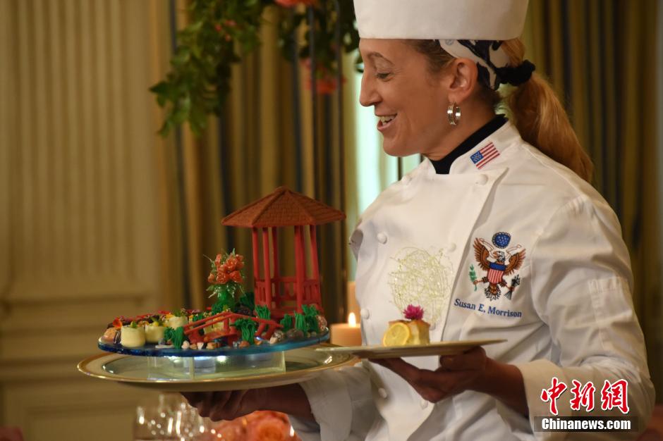 當(dāng)?shù)貢r(shí)間9月24日,美國白宮第一夫人辦公室發(fā)布了白宮為中國國家主席習(xí)近平和夫人彭麗媛舉行的國宴的菜單,并介紹了餐桌布置等情況。據(jù)這份菜單,紹興黃酒和南瓜月餅將亮相國宴。此外,白宮還邀請(qǐng)了華裔名廚參與此次國宴的準(zhǔn)備。中新社記者 刁海洋攝