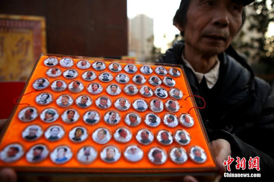 12月26日,是毛澤東誕辰122周年紀念日,河南鄭州紫荊山紫荊山廣場,鄭州退休老軍人李廷林依照毛澤東的照片或畫像制成的120枚毛澤東紀念章亮相。中新社記者 王中舉 攝