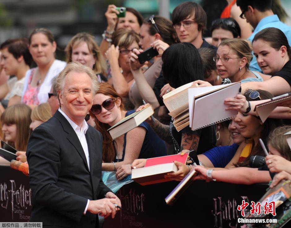 圖為2011年7月11日,電影《哈利·波特與死亡圣器2》在紐約林肯中心舉行首映式,阿倫·瑞克曼(Alan Rickman)現(xiàn)場(chǎng)為粉絲簽名。