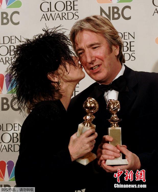 圖為1997年1月19日,阿倫·瑞克曼(Alan Rickman)獲得第54屆金球獎(jiǎng)時(shí)接受女演員海倫·米倫(Helen Mirren)的祝賀。