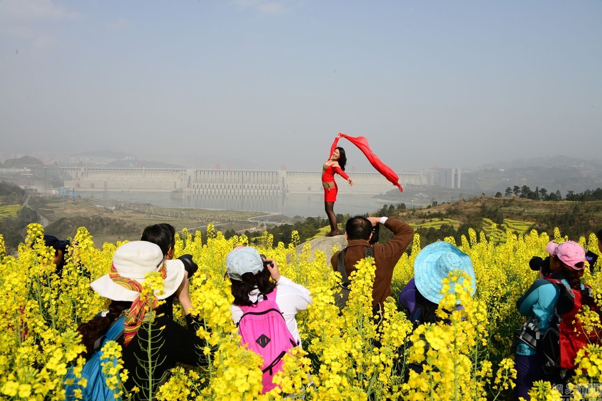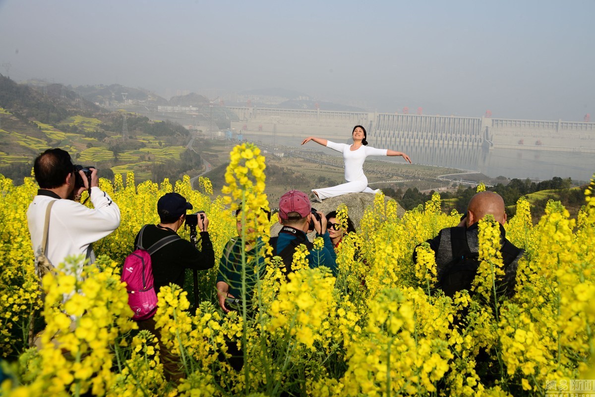2016年3月6日,湖北宜昌,隨著春季氣溫的回升,湖北宜昌三峽壩區(qū)高家溪油菜花絢麗綻放,把三峽大壩映襯得分外壯觀(guān)美麗,吸引了眾多攝影發(fā)燒友和游人前來(lái)踏青采風(fēng)游覽。當(dāng)天一位練瑜伽的大媽陶醉于壩前花海,秀起了瑜伽,一時(shí)吸引了攝影發(fā)燒友和游人瘋狂拍攝。圖為大媽花海中秀瑜伽。