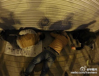 圖為沒買到票的球迷躺地上透過門縫觀看比賽。