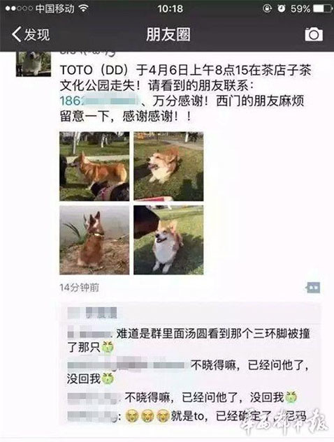 據(jù)主人李女士講述,“早上8點20分左右,我媽媽帶狗出去散步,它跟著別的狗跑丟了。我們找了很久。”李女士說,小狗跑丟后,在成都一愛寵微信群里,有群友稱在三環(huán)路上看到過它,“說是它橫穿三環(huán)路,把后腿撞到了,它就沿著三環(huán)路跑了?!眻D為李女士在朋友圈發(fā)布的尋狗信息。