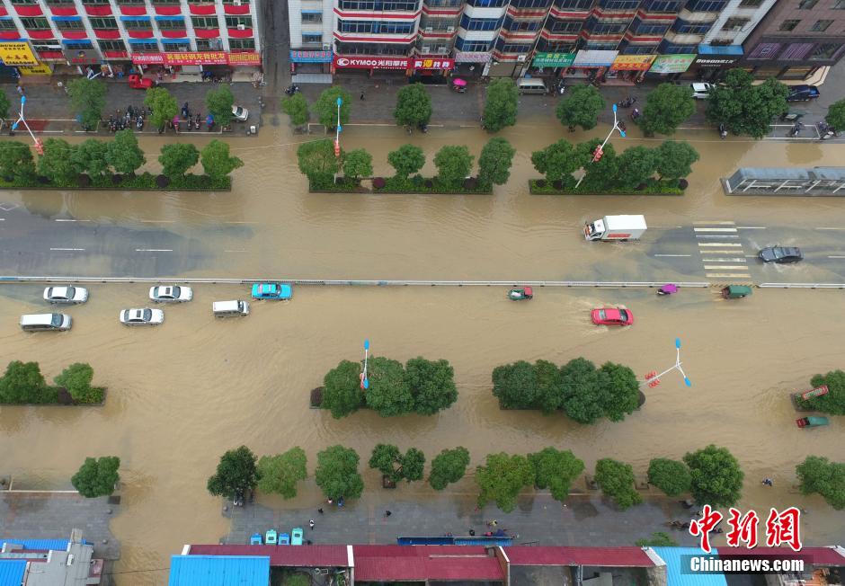 5月5日,地處湘南的永州市道縣遭遇暴風雨襲擊,縣城內(nèi)多處低洼路段被水淹沒。當?shù)胤姥床块T正嚴密監(jiān)控雨情、水情,確保安全度汛。 中新社發(fā) 何紅福 攝