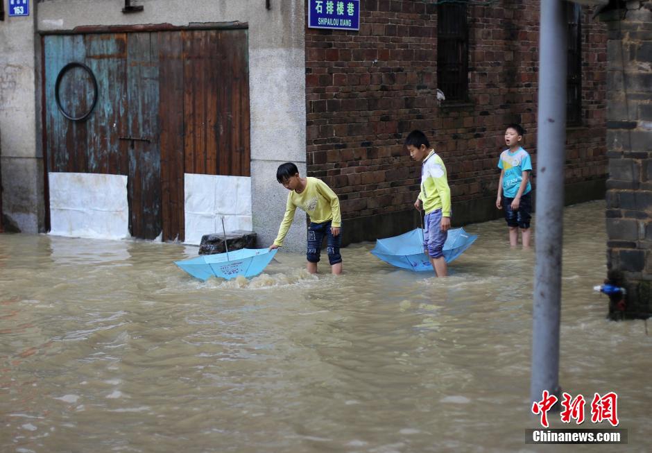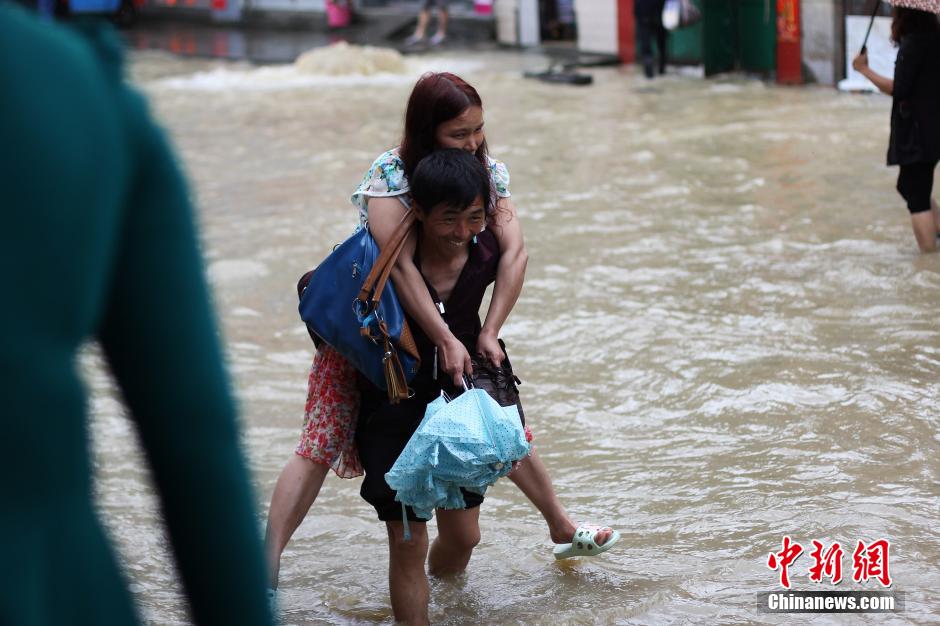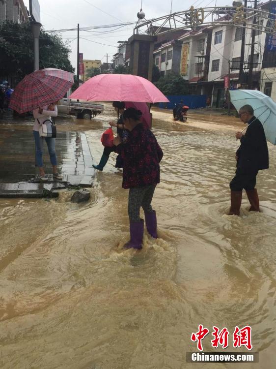 5月5日,地處湘南的永州市道縣遭遇暴風雨襲擊,縣城內(nèi)多處低洼路段被水淹沒。當?shù)胤姥床块T正嚴密監(jiān)控雨情、水情,確保安全度汛。圖為市民趟水出行。 中新社發(fā) 何紅福 攝