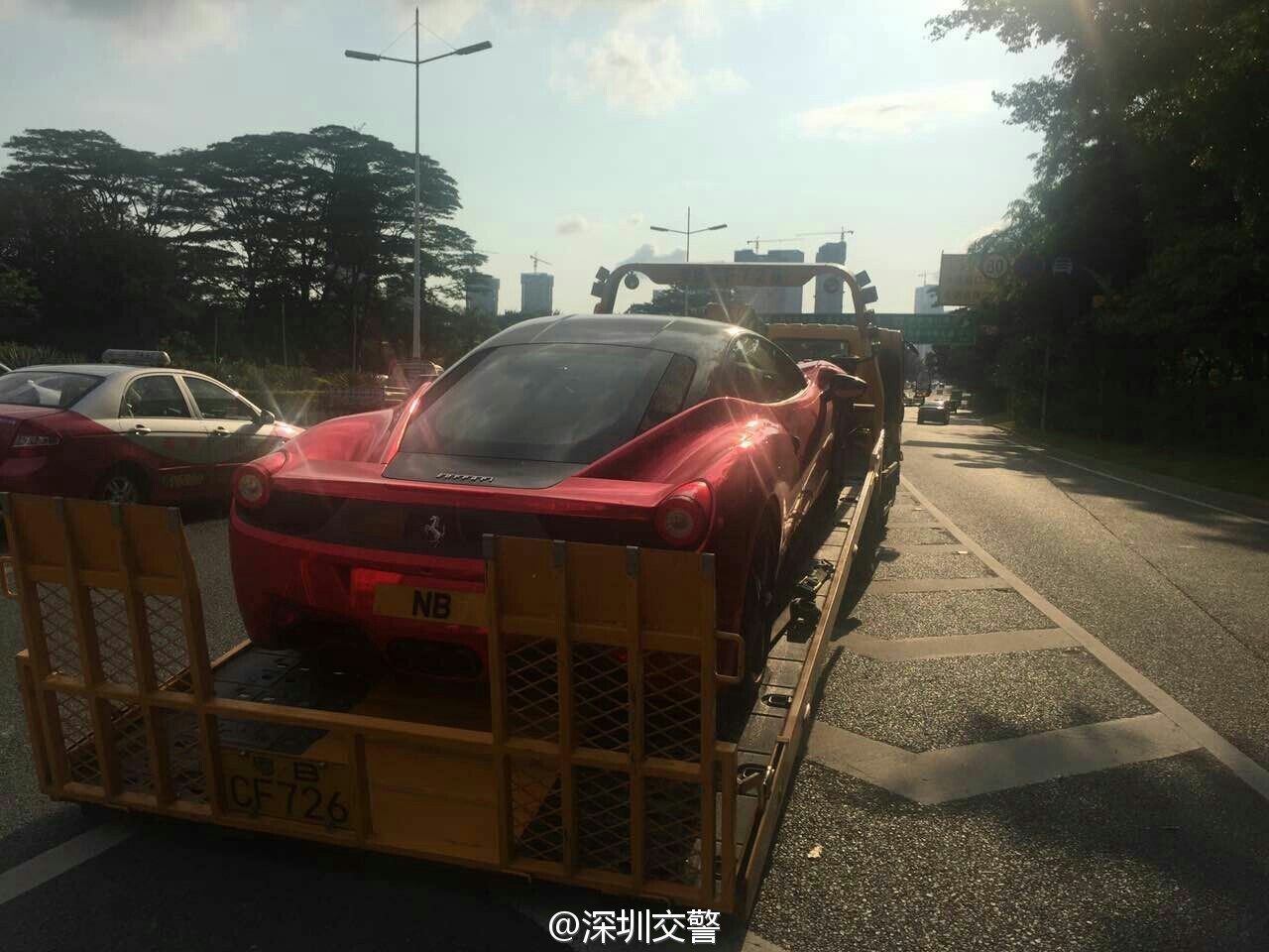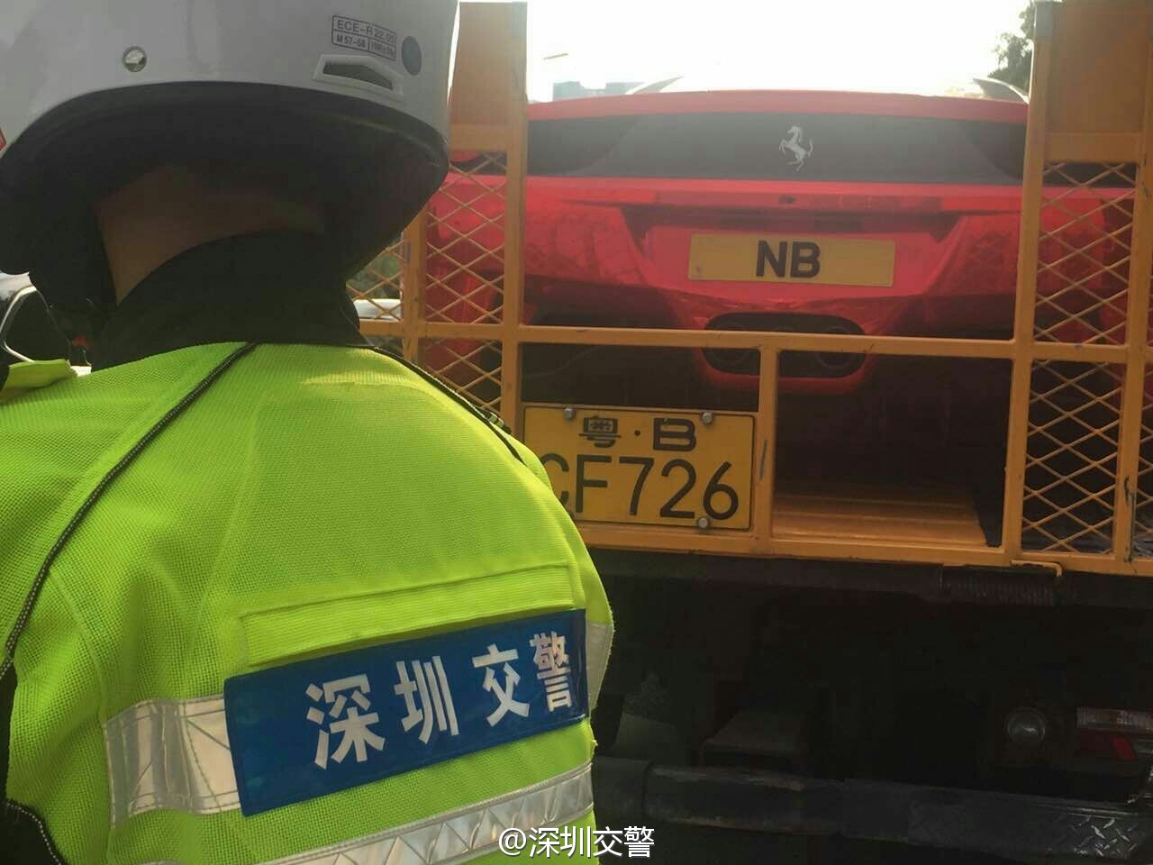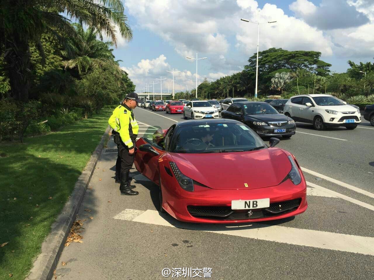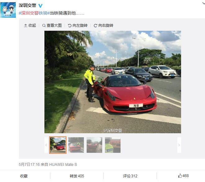 深圳交警5月7日17:16發(fā)布了一條微博:“當(dāng)鐵騎遇到他……”,同時配上四張圖片:只見一輛掛著“NB”車牌的紅色跑車被交警鐵騎攔下,最后被帶走。
