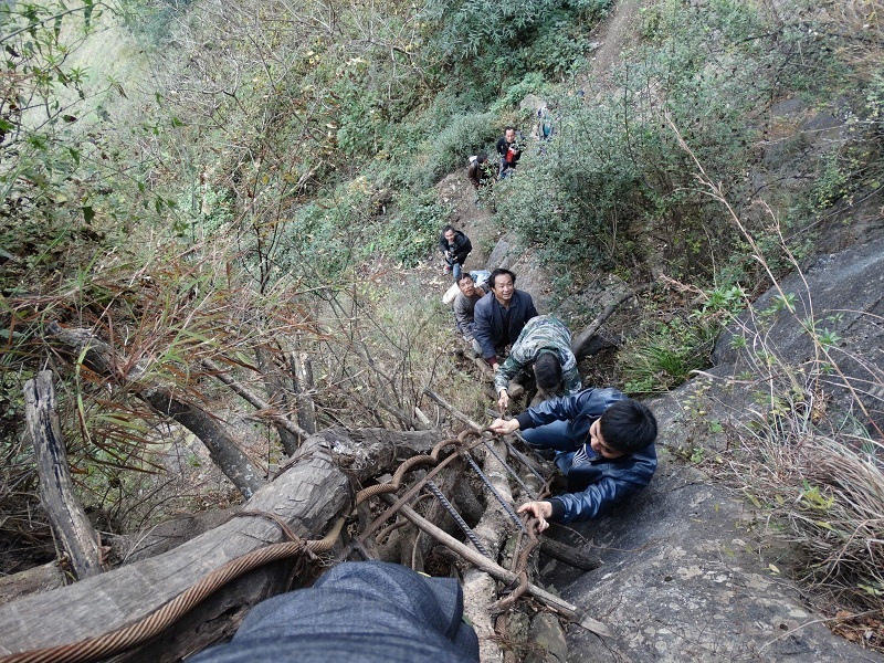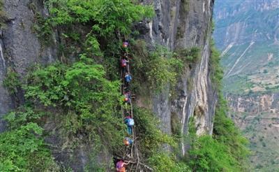 15個(gè)孩子中多數(shù)是女孩,在三個(gè)家長(zhǎng)的保護(hù)下,背著沉沉的書包,大約用了2個(gè)小時(shí),到達(dá)“懸崖村”。村里通向外界,需要順著懸崖斷續(xù)攀爬17條藤梯,其中接近村莊的幾乎垂直的兩條相連的藤梯長(zhǎng)度約100米,沒(méi)有藤梯的崖壁才是最危險(xiǎn)的。據(jù)支爾莫鄉(xiāng)黨委書記阿皮幾體講,他知道的在這條路上摔死的人有七八個(gè),有村里的人,也有外來(lái)的人,而摔傷的人更多。