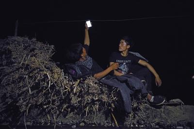 圖為5月12日晚上,村民坐在玉米稈上搜尋手機(jī)信號(hào),村里沒(méi)有發(fā)射塔,全靠山下發(fā)射到的微弱信號(hào)接收手機(jī)短信和打電話。9點(diǎn)多鐘,勒爾小學(xué)校長(zhǎng)吉克拉者帶著15個(gè)孩子到山下,其中有陳古吉的5個(gè)孩子,4個(gè)女孩1個(gè)男孩,最小的男孩叫陳木黑,6歲,讀學(xué)前班。爬山開始前,陳木黑被陳古吉系上背包繩。前面由一個(gè)家長(zhǎng)引路,中間一個(gè)家長(zhǎng),陳古吉帶著陳木黑走最后,6歲的陳木黑已經(jīng)在這條路上,上上下下幾十次了。在爬垂直藤梯的時(shí)候,陳古吉會(huì)從后面微微提繩,讓兒子能夠省點(diǎn)力氣,跟上前面的哥哥姐姐。在通過(guò)沒(méi)有任何附著物的崖壁上的道路時(shí),陳古吉就格外小心,緊抓繩子的手有時(shí)青筋暴起。他說(shuō),前些日子,一個(gè)娃滑了一下,幸好崖邊的藤條擋住了,才撿回一條命。