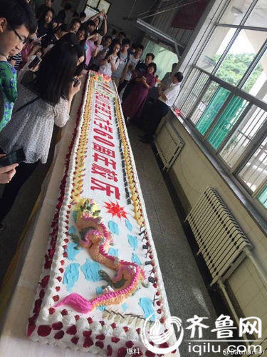 記者從網(wǎng)友發(fā)布的圖片中看到,在山東理工大學(xué)的某個(gè)食堂內(nèi),六米長(zhǎng)的水果蛋糕被學(xué)生圍城了一個(gè)圈,而在該食堂的陽(yáng)臺(tái)上站著一位老師,場(chǎng)面也十分歡樂。