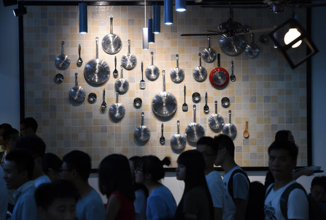 8月29日,學(xué)生們?cè)凇皶r(shí)尚餐吧”風(fēng)格的南航明故宮校區(qū)美食園餐廳排隊(duì)購(gòu)買飯菜。