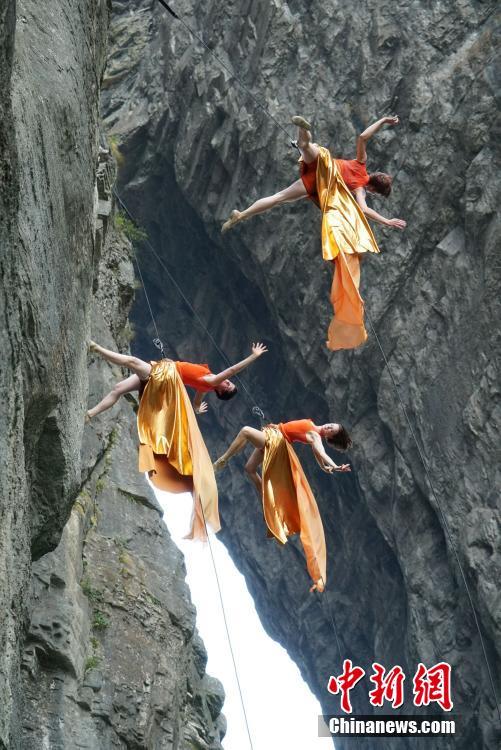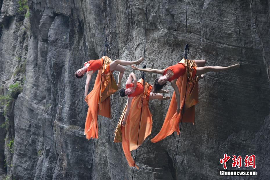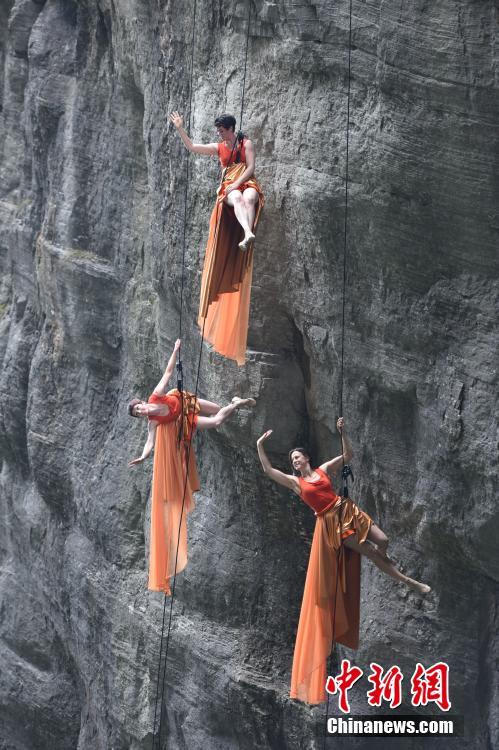9月13日,美國BANDALOOP高空舞蹈團在湖南張家界天門山的懸崖絕壁間盡情展現(xiàn)“垂直舞蹈”的藝術與魅力,其優(yōu)雅而驚險的舞姿與鬼斧神工般的自然奇景融合、互動,吸引了不少游客駐足欣賞。中新社發(fā) 向韜 攝