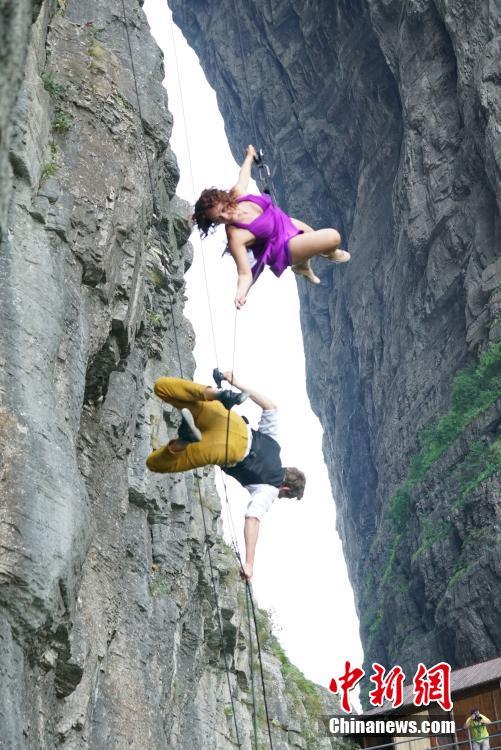 9月13日,美國BANDALOOP高空舞蹈團在湖南張家界天門山的懸崖絕壁間盡情展現(xiàn)“垂直舞蹈”的藝術與魅力,其優(yōu)雅而驚險的舞姿與鬼斧神工般的自然奇景融合、互動,吸引了不少游客駐足欣賞。中新社發(fā) Basil tsimoyanis 攝