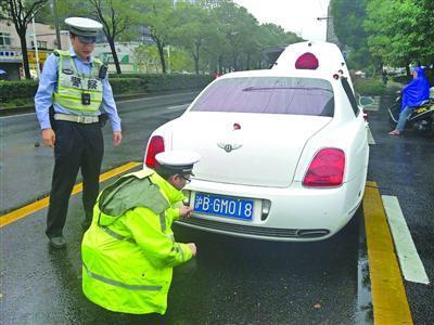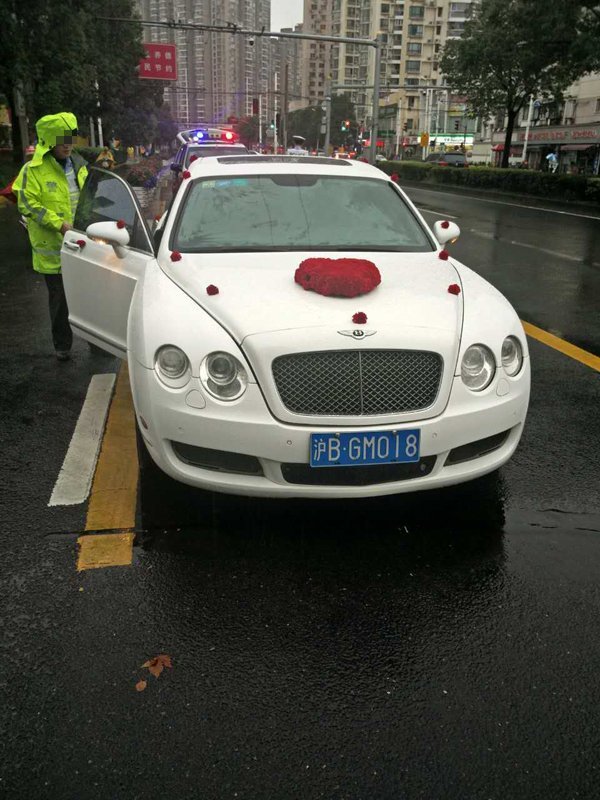 下午2點(diǎn)45分許,上海交警總隊(duì)機(jī)動(dòng)支隊(duì)巡邏時(shí),在周家嘴路近大連路處發(fā)現(xiàn)一路婚車車隊(duì),共計(jì)5輛車,其中領(lǐng)頭的是懸掛“滬BGM018”牌號的白色賓利歐陸跑車。后經(jīng)查實(shí),此車為套牌車。