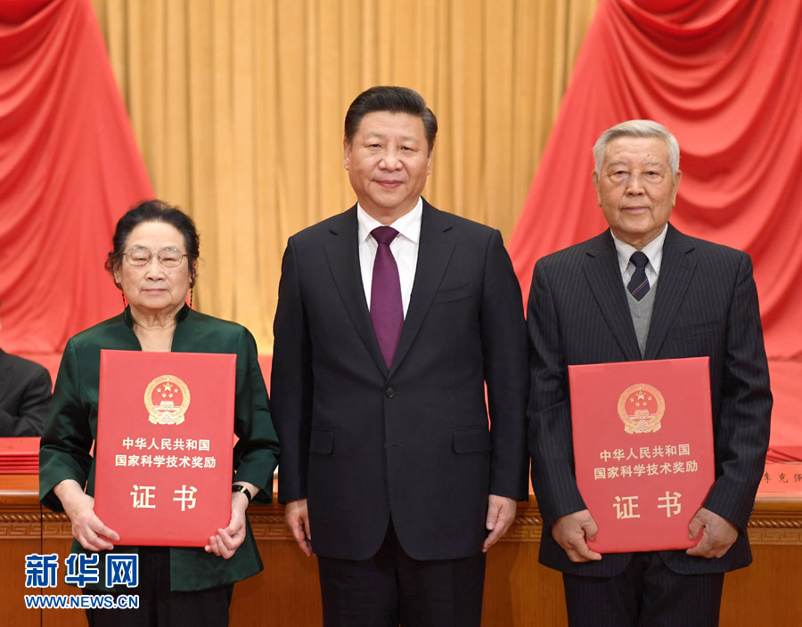 1月9日,2016年度國(guó)家科學(xué)技術(shù)獎(jiǎng)勵(lì)大會(huì)在北京人民大會(huì)堂隆重舉行。中共中央總書(shū)記、國(guó)家主席、中央軍委主席習(xí)近平向獲得2016年度國(guó)家最高科學(xué)技術(shù)獎(jiǎng)的中國(guó)科學(xué)院物理研究所趙忠賢院士(右)和中國(guó)中醫(yī)科學(xué)院屠呦呦研究員(左)頒獎(jiǎng)。新華社記者 李學(xué)仁 攝