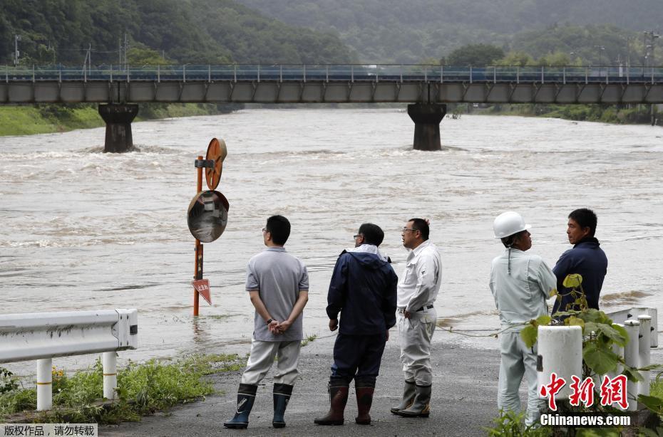 臺(tái)風(fēng)導(dǎo)致日本最少47班國內(nèi)線航班取消,3000名旅客受影響,3人因風(fēng)暴引起的事故受傷。圖為福岡縣朝倉地區(qū)的居民在洪水中跋涉。