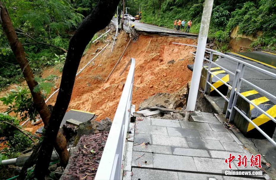 7月18日,深圳普降大暴雨局部特大暴雨,致部分路段嚴(yán)重積水、山體滑坡道路中斷、交通擁堵等險(xiǎn)情。深圳鹽田區(qū)盤(pán)山公路恩上路段出現(xiàn)滑坡,無(wú)人員、車輛被困;深鹽二通道下沙頭角出口匝道中間因山水傾瀉,道路中斷,交警已經(jīng)實(shí)施了交通管制。當(dāng)?shù)貧庀蟛块T先后發(fā)布了雷電、暴雨黃色、暴雨橙色和暴雨紅色分區(qū)預(yù)警信號(hào)。圖為深圳鹽田區(qū)盤(pán)山公路恩上路段出現(xiàn)滑坡道路中斷。中新社記者 鐘新 攝