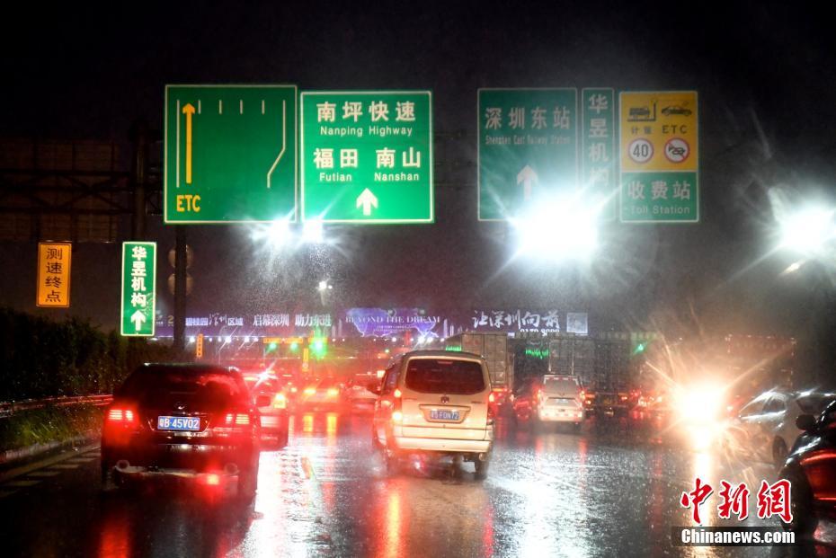 7月18日,深圳普降大暴雨局部特大暴雨,致部分路段嚴(yán)重積水、山體滑坡道路中斷、交通擁堵等險(xiǎn)情。深圳鹽田區(qū)盤(pán)山公路恩上路段出現(xiàn)滑坡,無(wú)人員、車輛被困;深鹽二通道下沙頭角出口匝道中間因山水傾瀉,道路中斷,交警已經(jīng)實(shí)施了交通管制。當(dāng)?shù)貧庀蟛块T先后發(fā)布了雷電、暴雨黃色、暴雨橙色和暴雨紅色分區(qū)預(yù)警信號(hào)。圖為深圳南坪快速路段車輛行駛緩慢。中新社記者 陳文 攝