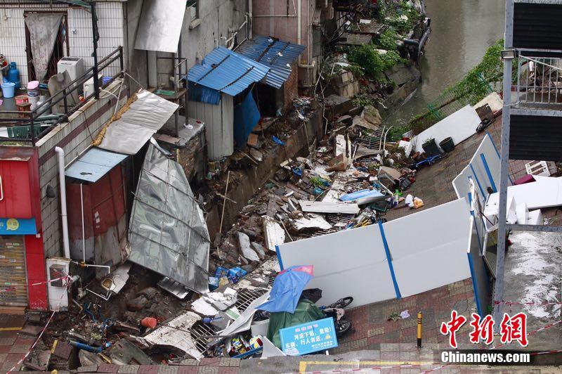 7月18日,深圳普降大暴雨局部特大暴雨,致部分路段嚴(yán)重積水、山體滑坡道路中斷、交通擁堵等險(xiǎn)情。深圳鹽田區(qū)盤(pán)山公路恩上路段出現(xiàn)滑坡,無(wú)人員、車輛被困;深鹽二通道下沙頭角出口匝道中間因山水傾瀉,道路中斷,交警已經(jīng)實(shí)施了交通管制。當(dāng)?shù)貧庀蟛块T先后發(fā)布了雷電、暴雨黃色、暴雨橙色和暴雨紅色分區(qū)預(yù)警信號(hào)。圖為深圳寶安區(qū)西鄉(xiāng)永安商業(yè)城門前區(qū)域坍塌,長(zhǎng)約15米、寬約6米的塌陷。中新社記者 鐘新 攝