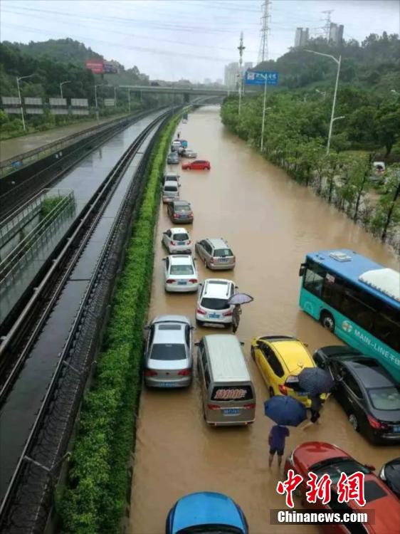 7月18日,深圳普降大暴雨局部特大暴雨,致部分路段嚴(yán)重積水、山體滑坡道路中斷、交通擁堵等險(xiǎn)情。深圳鹽田區(qū)盤(pán)山公路恩上路段出現(xiàn)滑坡,無(wú)人員、車輛被困;深鹽二通道下沙頭角出口匝道中間因山水傾瀉,道路中斷,交警已經(jīng)實(shí)施了交通管制。當(dāng)?shù)貧庀蟛块T先后發(fā)布了雷電、暴雨黃色、暴雨橙色和暴雨紅色分區(qū)預(yù)警信號(hào)。圖為深圳龍崗金銀坑路段嚴(yán)重積水。中新社記者 鐘欣 攝