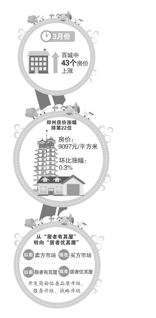 中國指數(shù)研究院昨日發(fā)布的百城房價指數(shù)顯示,3月份,100個城市中有43個房價上漲,全國房價環(huán)比整體跌幅收窄,微跌0.15%,同比跌幅繼續(xù)擴大,下跌4.35%。其中,鄭州3月份新建商住房均價為9097元/平方米,環(huán)比上漲0.3%,漲幅在全國排到第22位。
