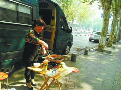圖片顯示,一輛墨綠色的房車停在一所學(xué)校的大門附近,房車旁邊,一名中年婦女正揮舞鍋鏟當(dāng)街炒菜,不少路人駐足圍觀。