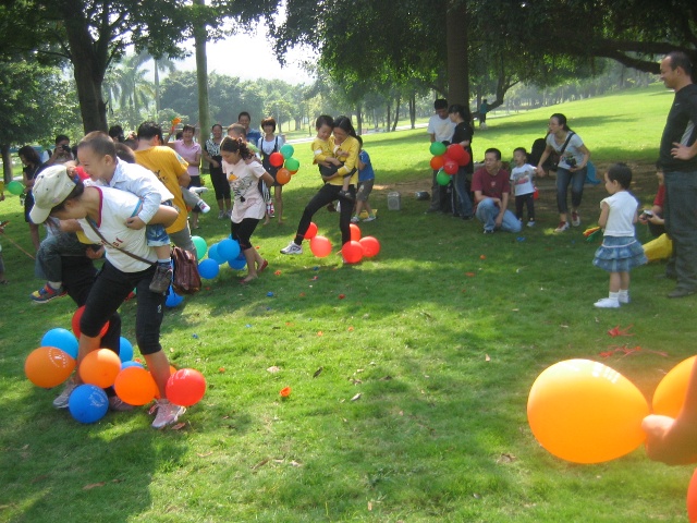 游戲規(guī)則:每個(gè)家庭由一名家長和一名孩子參加,由工作人員給參與的每個(gè)家庭發(fā)三個(gè)氣球和一根細(xì)繩,請(qǐng)家長將氣球吹大綁在自己的腳腕,身背孩子。聽到主持人的口令游戲開始,家長就背著寶寶踩其他家庭的氣球,在互相踩氣球的同時(shí),首先要注意安全,其次要保護(hù)自己的氣球,還要將別的家庭的氣球踩破,氣球被踩爆即被淘汰,比一比誰是冠軍。
