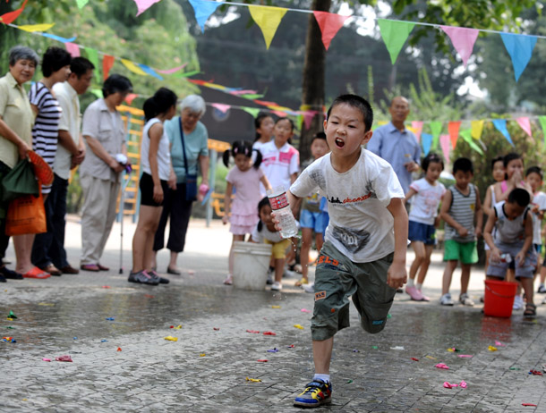 游戲規(guī)則:跑道前方設(shè)置一個(gè)水桶 起點(diǎn)外設(shè)置一個(gè)大塑料瓶,比賽開始時(shí),小朋友持水杯到水桶內(nèi)盛水后返回倒入大塑料瓶處,由孩子和兩個(gè)家長依次進(jìn)行盛水接力,大塑料瓶盛滿水者為勝(注:塑料瓶身內(nèi)設(shè)若干漏點(diǎn))?;顒?dòng)共7個(gè)家庭參與,取前三名進(jìn)行頒獎(jiǎng),所有參與的家庭均有參與獎(jiǎng)。