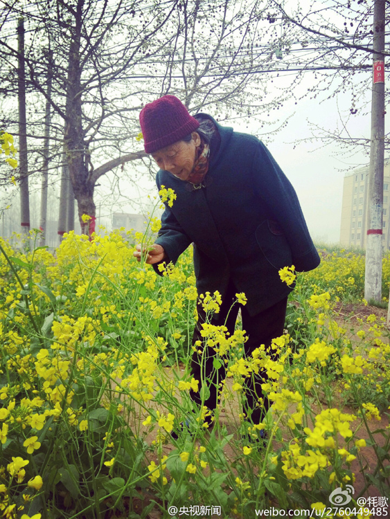 4月4日,網(wǎng)友“牦歌”在微博上曬出了一組照片,題為“你的皺紋比歲月更美”,照片的主角是“我奶奶”。一片金黃的油菜花田中,一位身穿灰色大衣,頭戴棗紅色線帽的老人或轉(zhuǎn)身回眸淺笑,或低頭輕聞花香,還45°角仰望天空,甚至單腳站立擺出“大”字狀。最可愛的要數(shù)老人擷取了一支油菜花插在耳邊,如果不是面龐已布滿皺紋,老人就如同一個嬌羞的小姑娘。圖為奶奶45°角仰望天空。